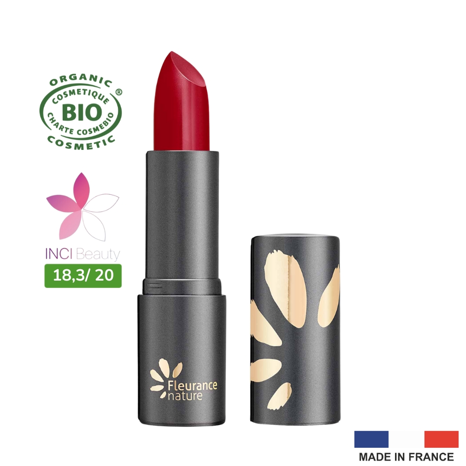 RICINUS COMMUNIS (CASTOR) SEED OIL*, HELIANTHUS ANNUUS (SUNFLOWER) SEED OIL*, COPERNICIA CERIFERA (CARNAUBA) WAX*, CI 75470 (CARMINE), JOJOBA ESTERS, TRIBEHENIN, HELIANTHUS ANNUUS (SUNFLOWER) SEED WAX, SILICA, CI 77891 (TITANIUM DIOXIDE), CI 77491 (IRON OXIDES), ARGANIA SPINOSA KERNEL OIL*, CANDELILLA CERA, PARFUM (FRAGRANCE), LECITHIN, ACACIA DECURRENS FLOWER WAX, POLYGLYCERIN-3, TOCOPHEROL, ASCORBYL PALMITATE, AQUA (WATER), CITRIC ACID. *Ingrédients issus de l’agriculture biologique 100% du total est d’origine naturelle 67% du total des ingrédients sont issus de l’agriculture biologique COSMOS ORGANIC certifié par Ecocert Greenlife selon le référentiel COSMOS disponible sur http://COSMOS.ecocert.com Ce produit n’a pas été testé sur les animaux, conformément à la règlementation européenne.Chez Fleurance Nature, nous sommes convaincus des bienfaits du bio pour notre santé et notre environnement depuis toujours et nous avons à cœur de le rendre accessible au plus grand nombre.